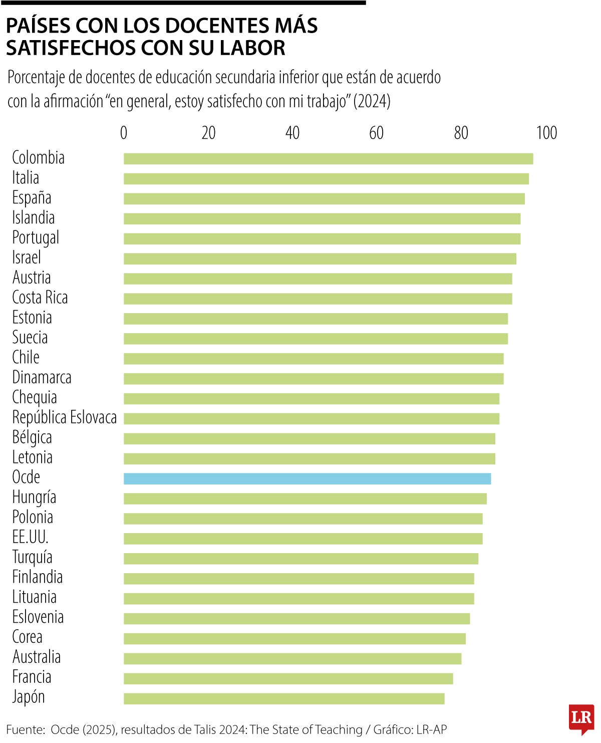 Detrás del país se encuentran España, Italia, Islandia, Portugal e Israel, mientras que en los últimos escaños se encuentran Japón, Francia, Australia, Corea y Eslovenia.