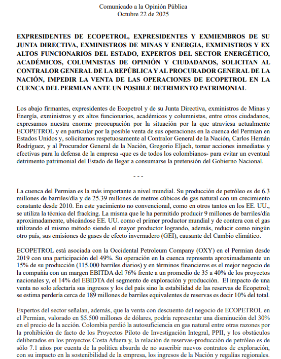 Al menos 70 exfuncionarios del Ministerio de Minas, exmiembros de Ecopetrol y otros expertos firmaron una carta en la que le pidieron al contralor general de la República y al procurador general de la Nación, impedir la venta de las operaciones de la estatal petrolera en la cuenca del Permian en EE.UU., por lo que definieron como un posible detrimento patrimonial