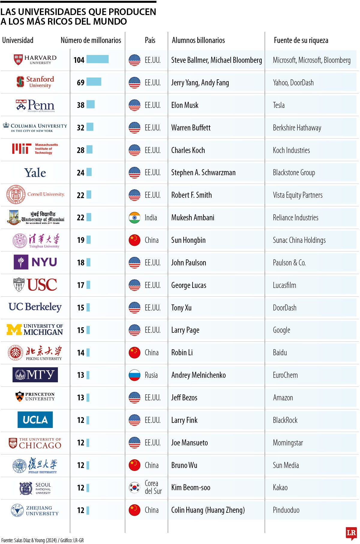 La universidad ha producido más de 100 multimillonarios que tienen una riqueza combinada de cerca de US$600.000 millones, y eso sin contar nombres como Bill Gates y Mark Zuckerberg, quienes estudiaron allí pero no completaron sus estudios.